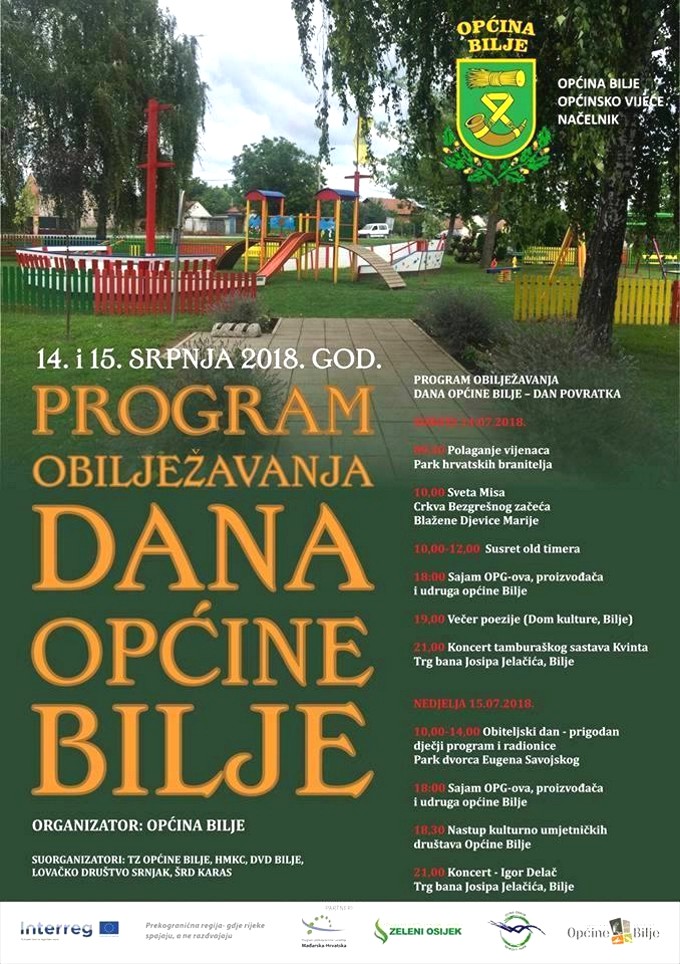 U subotu i nedjelju, 14-15. VII. 2018. godine, obilježavaju se Dani Općine Bilje. Program, između ostaloga, obuhvaća susret oldtajmera, sajam OPG-ova, proizvođača i udruga, večer poezije, koncerte Tamburaškog sastava "Kvinta" i Igora Delača, obiteljski dan, nastup KUD-ova...