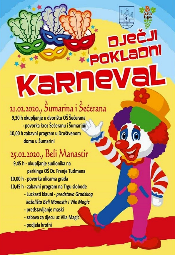 Grad Beli Manastir i Turistička zajednica Baranje organiziraju Dječji pokladni karneval 21. II. 2020. godine u Šumarini i Šećerani, a 25. II. 2020. u Belom Manastiru. Za najmlađe, uz već tradicionalnu povorku, pripremljen je i bogat zabavni program, što se može vidjeti i na priloženom plakatu.
