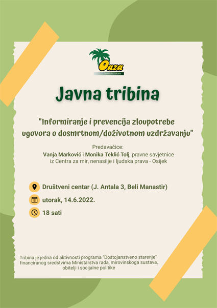 U utorak, 14.6.2022. godine, s početkom u 18 sati, u potkrovlju Društvenog centra, po programu "Dostojanstveno starenje" Ministarstva rada, mirovinskoga sustava, obitelji i socijalne politike, održana je javna tribina na temu "Informiranje i prevencija zloupotrebe ugovora o dosmrtnom/doživotnom uzdržavanju".