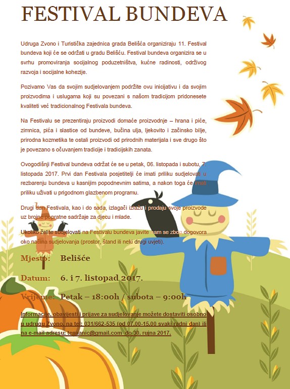 Udruga Zvono i Turistička zajednica Grada Belišća organiziraju 11. Festival bundeva, koji će se održati u Belišću u petak, 6. X., s početkom u 18 sati, i u subotu, 7. X. 2017. godine, s početkom u 9 sati. Festival bundeva organizira se u svrhu promoviranja socijalnog poduzetništva, kućne radinosti, održivog razvoja i socijalne kohezije.